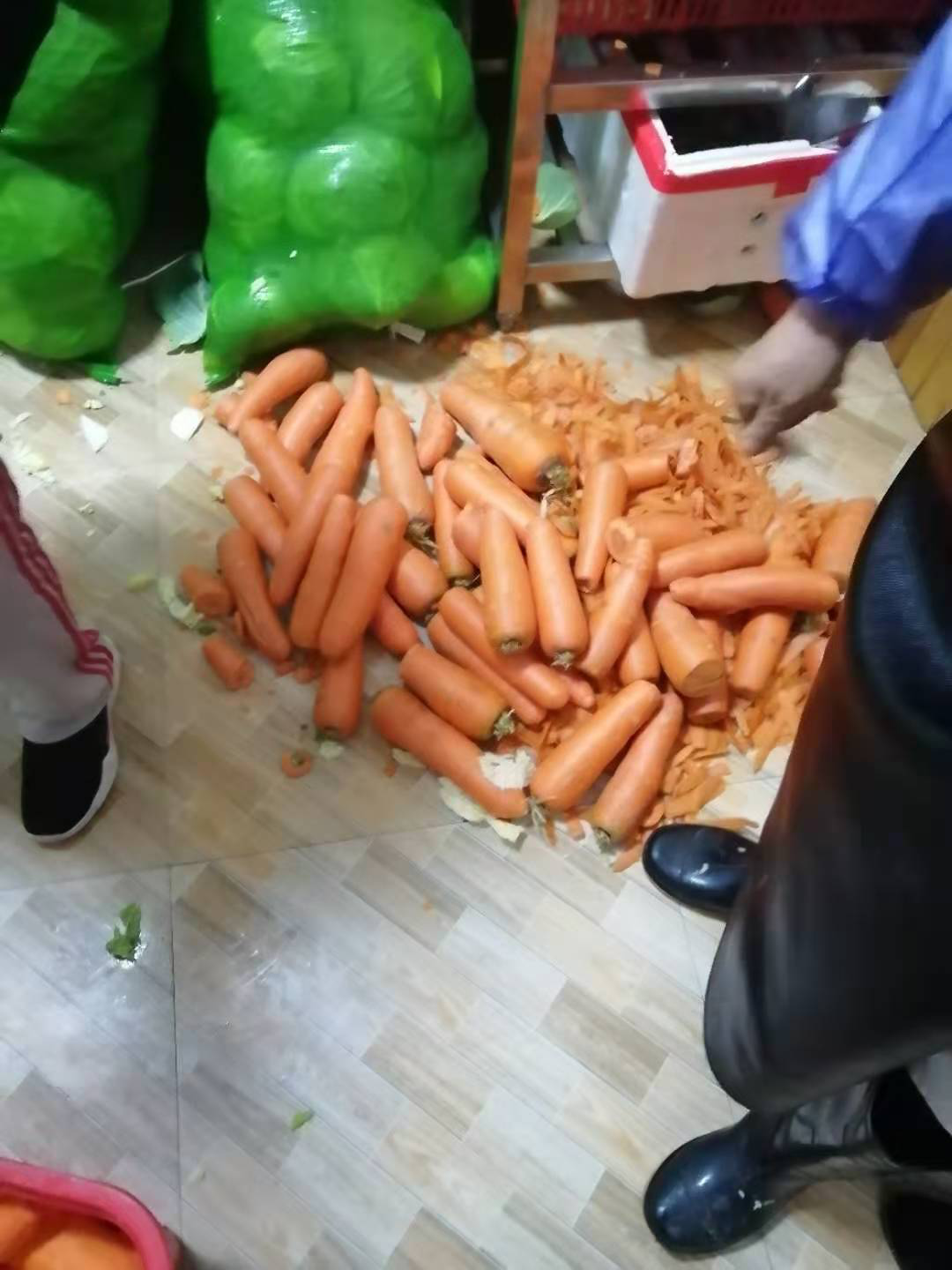 记者在加佳欣餐饮有限公司看到,餐车送餐工作人员、为学生分餐的工作人员、操作间加工食品的工作人员均未按要求佩戴口罩。整个操作间污水横流,未做防滑措施,垃圾桶也未加盖;熟食柜里摆放着纸箱装的生食,生食冷柜里有放着两盘员工吃剩的饭菜,生熟混放,交叉污染;操作间食品架上员工的生活物品随处可见,仅有的一个消毒柜也未通电;在食品储藏室,工作人员就直接在地面上加工蔬菜,削皮的胡萝卜就直接放在地上。