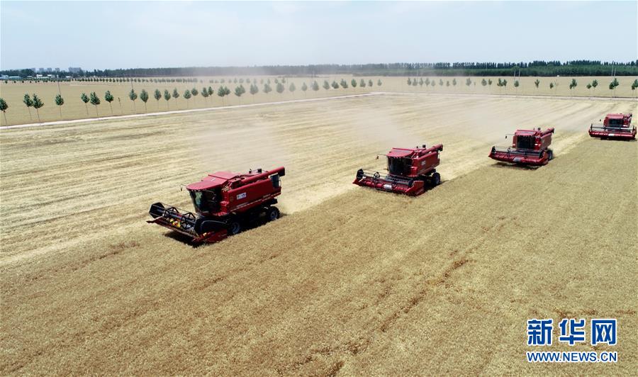 6月10日,收割机在河北省南和县闫里乡闫里村麦田开展夏收作业。眼下正是河北省“三夏”农忙时节,河北省共投入200万台农业机械,确保夏粮颗粒归仓,秋粮适时播种。